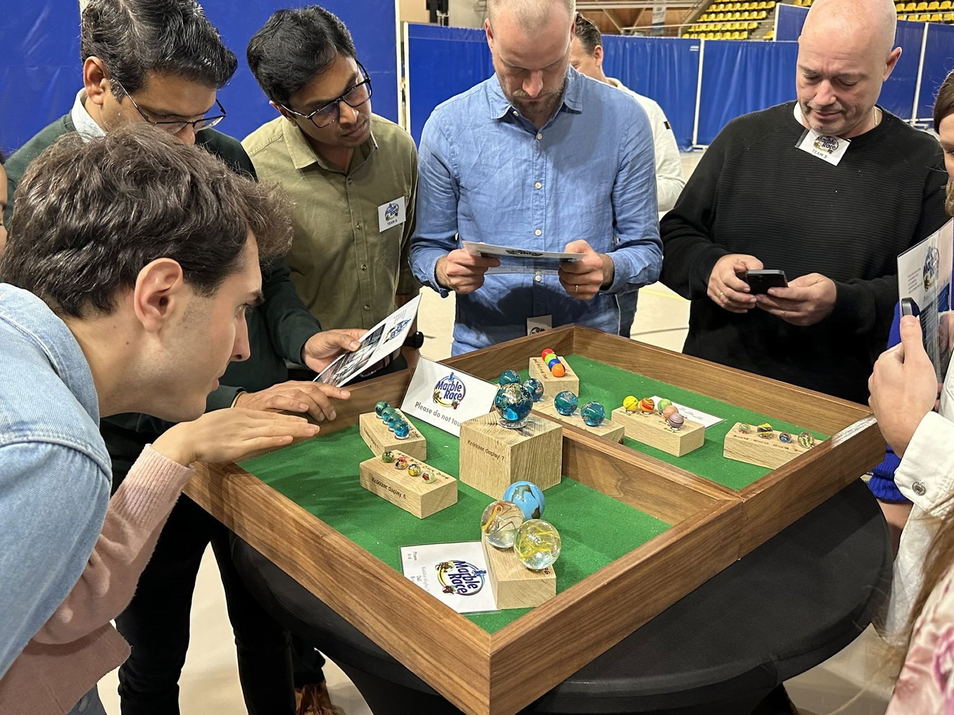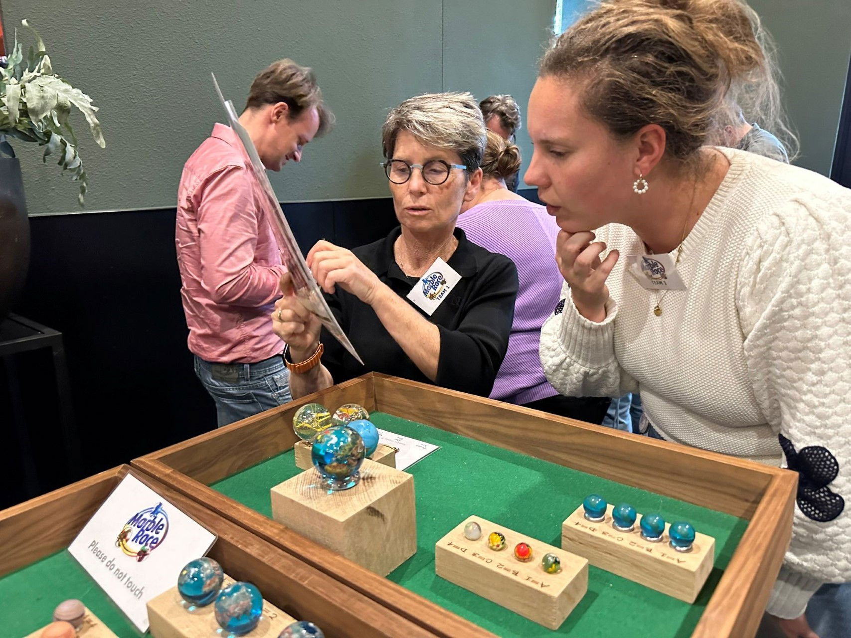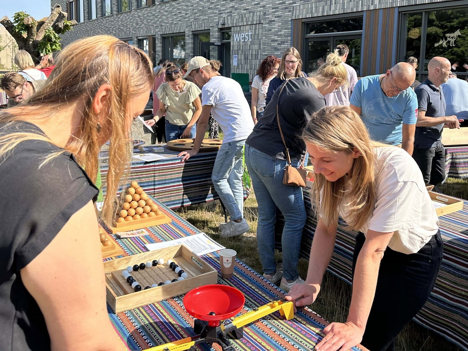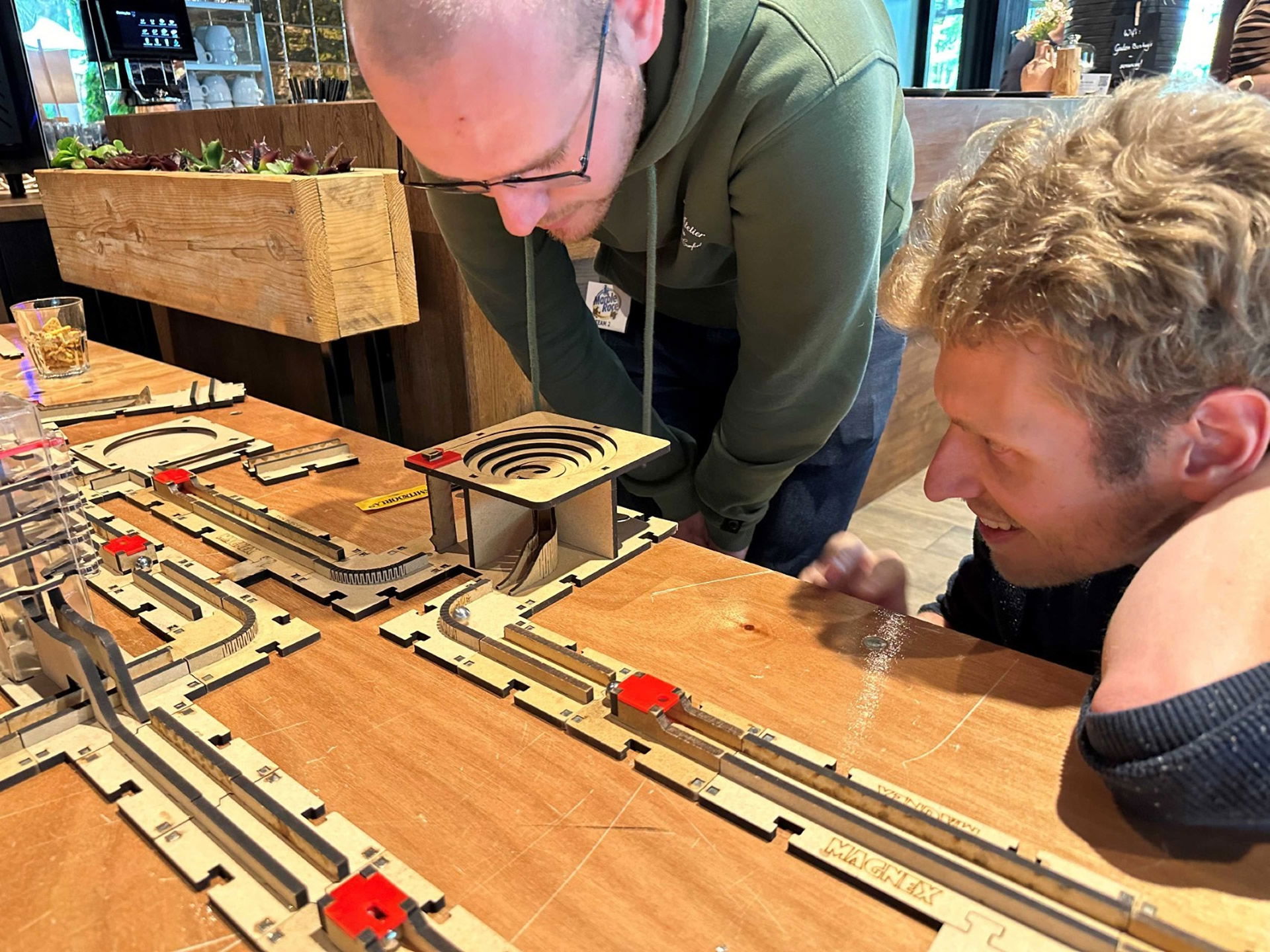 Van onze fraai uitgevoerde spellen, waarin knikkers altijd een rol spelen, zeggen de deelnemers dat ze 90% van de spellen niet kennen, maar er wél door verrast te zijn! Het betreft een mix van strategie-, denk- en behendigheidsspellen. Enkele van de speltitels: Galtoni, Gears, Paletto, Pentago, Mabula, Weykick en Pylos